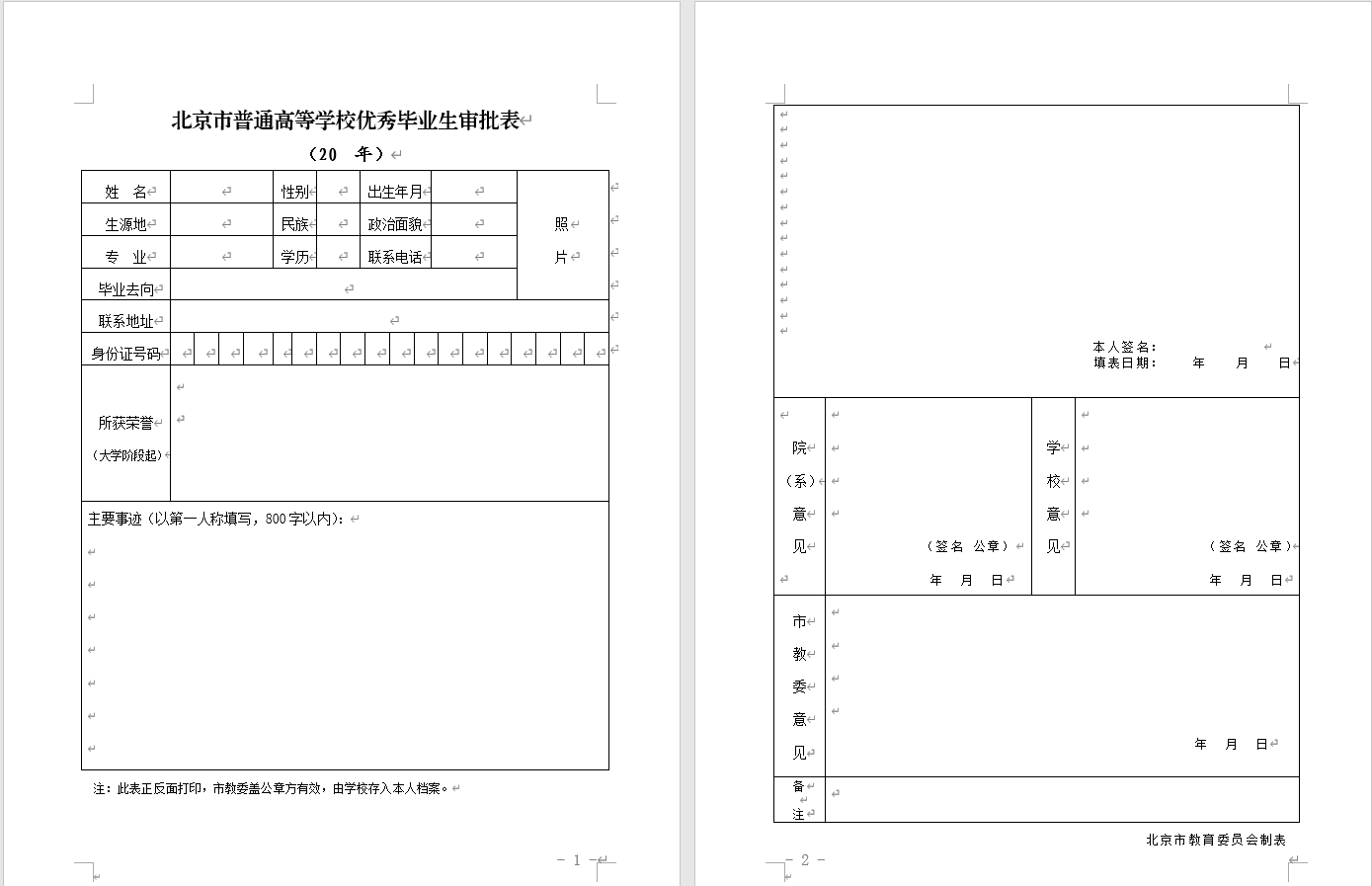 1. 《北京地区高等学校优秀毕业生登记表》