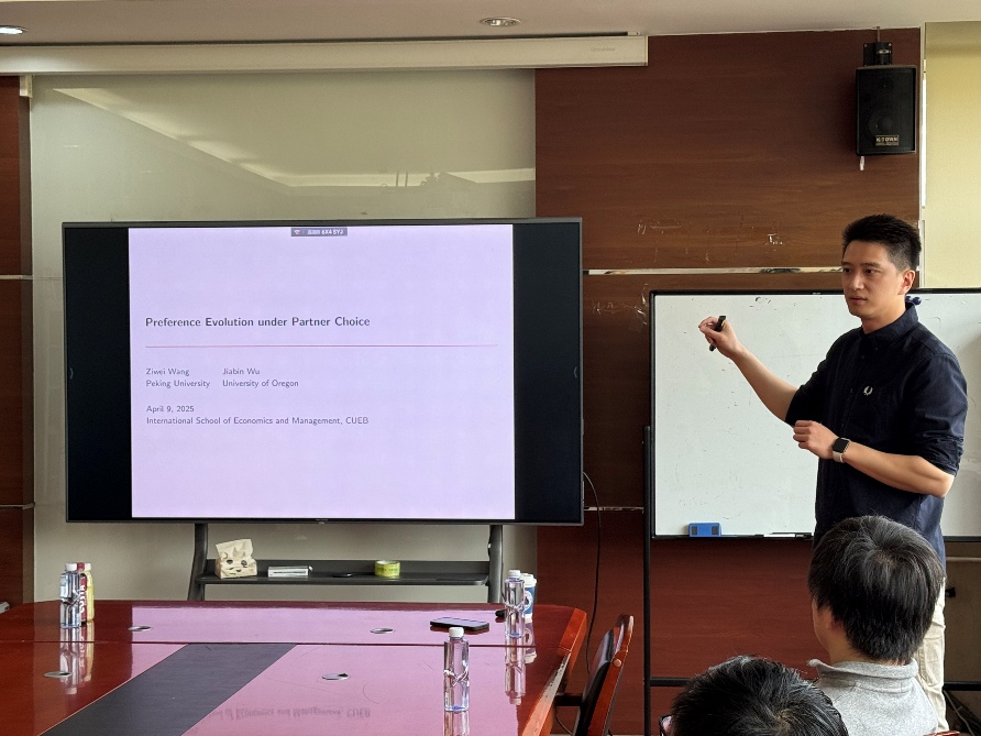4月9日,王子伟老师为足交 师生作了题为《配对选择中的偏好进化》(《Preference Evolution under Partner Choice》)的学术报告。报告研究了内生匹配下的偏好演化:短期中个体主观偏好影响社交互动中的伴侣选择与行为,进而决定物质收益并驱动长期偏好进化。分析表明,内生匹配会进化出兼具亲缘偏见与高效合作能力的稳定偏好,这些偏好通过促成同类匹配与联合收益最大化占据优势;而在信息不完全时,狭隘主义等强亲缘偏见能通过强化自我分类动机成为演化稳定的关键。