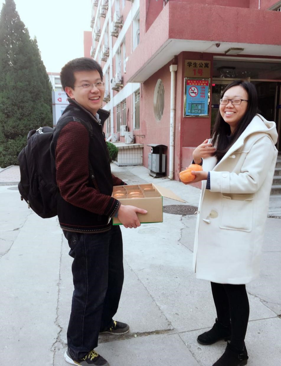 “幽姿不入少年场。无语只凄凉。一个飘零身世,十分冷淡心肠。” 11月11日俗称光棍节,加之同学们经历了三门期中考试的洗礼,孑然一身,孤独与凄凉。本周五,足交 李劭琛师兄和夏晓佳师姐代表足交 和研会给研一同学们带去了来自足交 的中期慰问。 这次的慰问品是两箱柿子,秋冬吃柿子可以清热止血,中医有云柿霜润肺,多吃柿子也有助于对抗雾霾。师兄师姐把柿子送到了宿舍,并关切的询问了同学们的学习和生活情况。大家表示虽然柿子是凉性水果,但握在手里,竟感受到浓浓的温暖。
