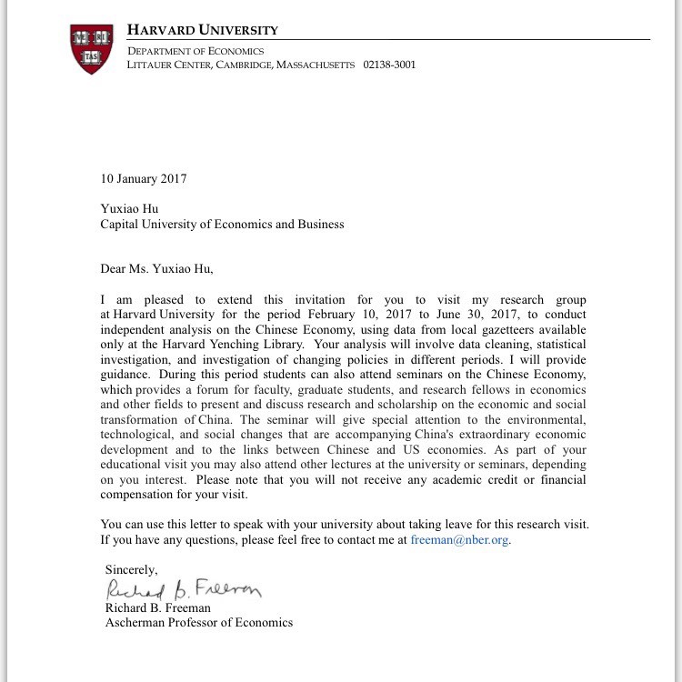 2015级研究生胡雨霄同学受世界著名经济学家Richard B. Freeman邀请,前往美国哈佛大学从事为期长达半年的学术研究,与哈佛大学的学者们共同在国民经济研究所(National Bureau of Economic Research)研究中国经济问题。国际经管足交