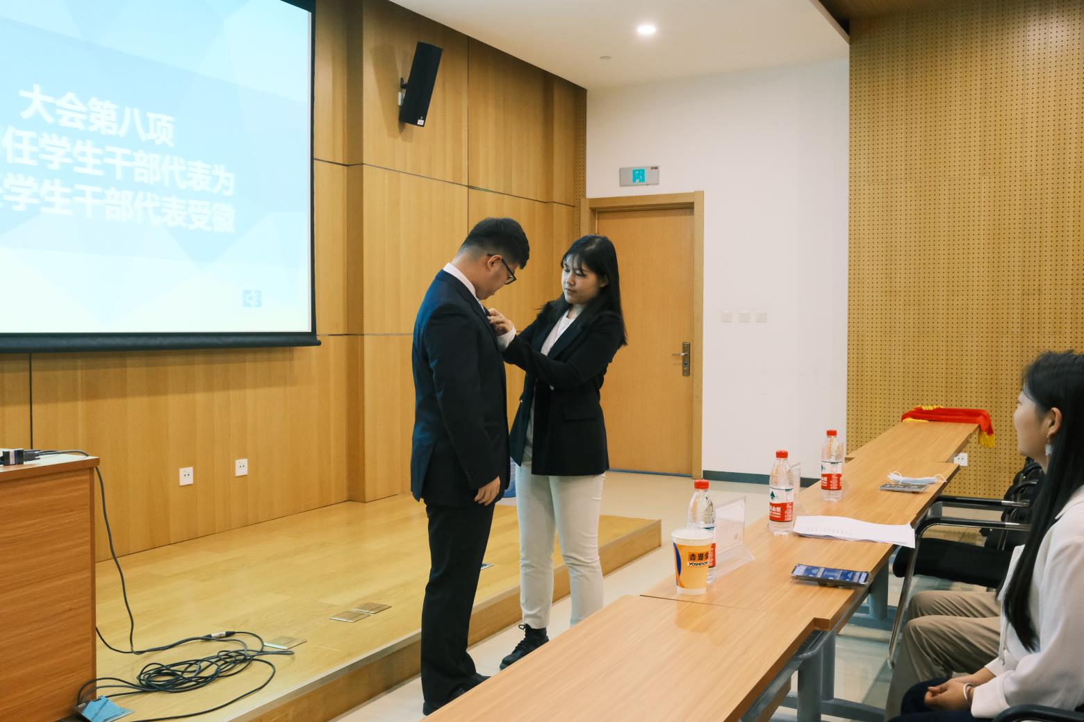 大会第四项,第六届学生干部代表蒋汝艺为新任干部授徽,标志着足交 学生组织揭开了崭新的一页。